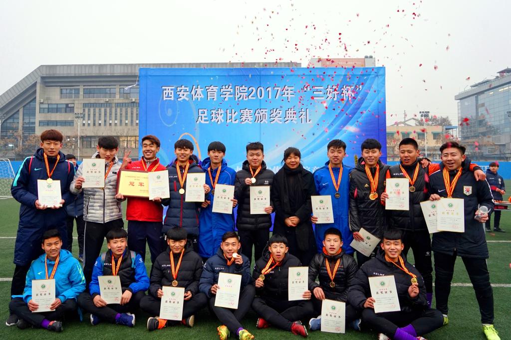 本网讯 由竞训处主办,足球学院承办的2017年“三好杯”足球比赛于2018年1月2日在我院足球场顺利落下帷幕。纪委书记赵军、党委宣传部部长高月宏、竞训处处长张鹏华、足球学院院长朱军、运动训练系主任张葆欣、社会体育系主任郑文海及足球教研室教师到场观看并出席了颁奖典礼。