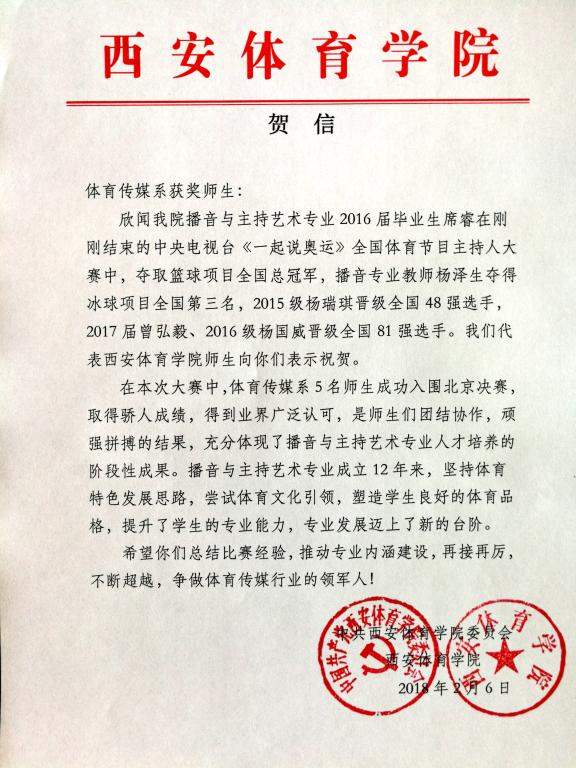 本网讯 我院播音与主持艺术专业2016届毕业生席睿在刚刚结束的中央电视台《一起说奥运》全国体育节目主持人大赛中,夺得篮球项目全国总冠军,教师杨泽生夺得冰球项目全国第三名,2015级学生杨瑞琪晋级全国48强,2017届学生曾弘毅、2016级学生杨国威晋级全国81强。为此,我院党政发去贺信,表示热烈的祝贺和诚挚的慰问。贺信全文如下: