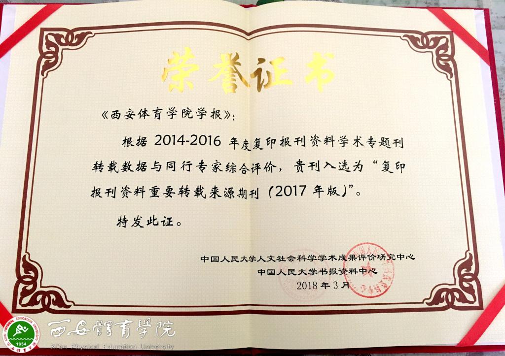 2017年度转载学术指数排行,共有745种期刊榜上有名,其中体育学期刊数量共有13种。“人大复印报刊资料”的转载量、转载率、综合指数等指标,主要依据转载论文的学术创新程度、论证完备程度、社会价值、难易程度等方面进行同行评议,现已被学术界和期刊界视为人文社科学术评价的主要参考依据,本次入选结果也与北京大学《中文核心期刊要目总览(2014年版)》、南京大学《中文社会科学引文来源目录(2014-2016年)》、中国社会科学院《中国人文社会科学核心期刊要览(2013年版)》进行对比,具有较高的耦合度与准确度,这一结果更是北京大学《中文核心期刊要目总览》、中国社科院《中国人文社会科学核心期刊要览》、教育部“名刊名栏”工程、武汉大学中国科学评价研究中心等作为期刊评价的重要指标之一。