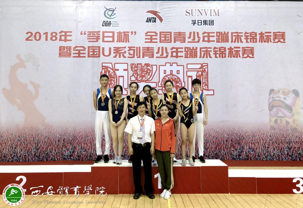 比赛期间,运动员们在我院蹦床教练任钊、郭佳的带领下发挥出色,经过顽强拼搏,最终获得了5金2银3铜的优异成绩。其中,张雪儿在7月13号上午女子15-16岁组双蹦床决赛获得个人冠军;女子15-16岁组张雪儿、李文琦、束心儿获得了双蹦床团体冠军;男子13-14岁组韩钟锐在决赛中获得个人双蹦床冠军;女子11-12岁组岳童瑶在决赛中获得了个人双蹦床冠军;7月13号下午的女子15-16岁组单跳比赛中张林代表陕西队获得了个人单跳冠军;7月9日上午男子15-16岁组双蹦床决赛中田栋宇获得亚军;女子11-12岁组决赛中晋玺辕获得了个人双蹦床亚军;女子15-16岁组束心儿获得个人双蹦床季军;7月9号下午的决赛中女子11-12岁组岳童瑶、晋玺辕获得了双人同步季军;女子15-16岁组李文琦、束心儿获得了双人同步季军。