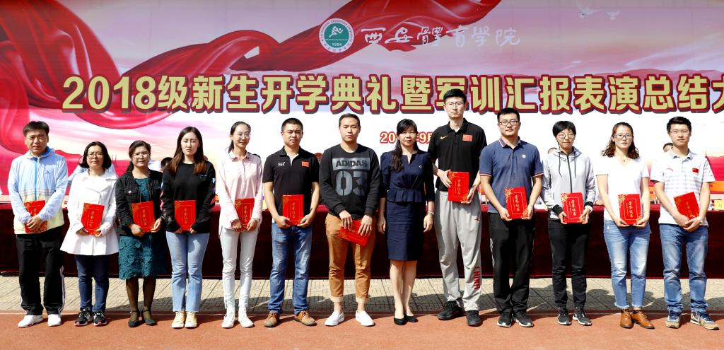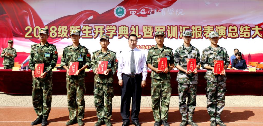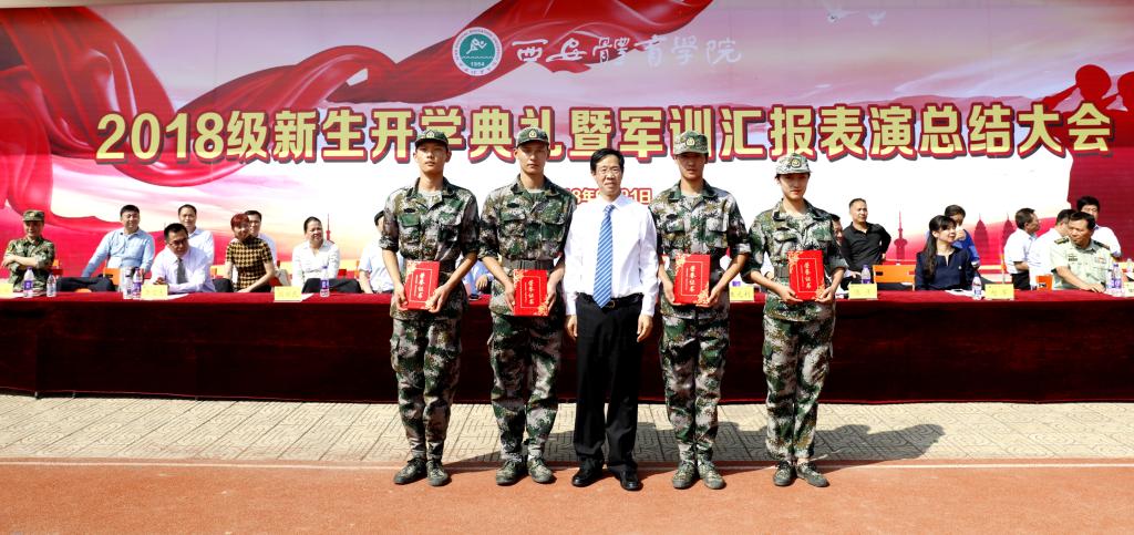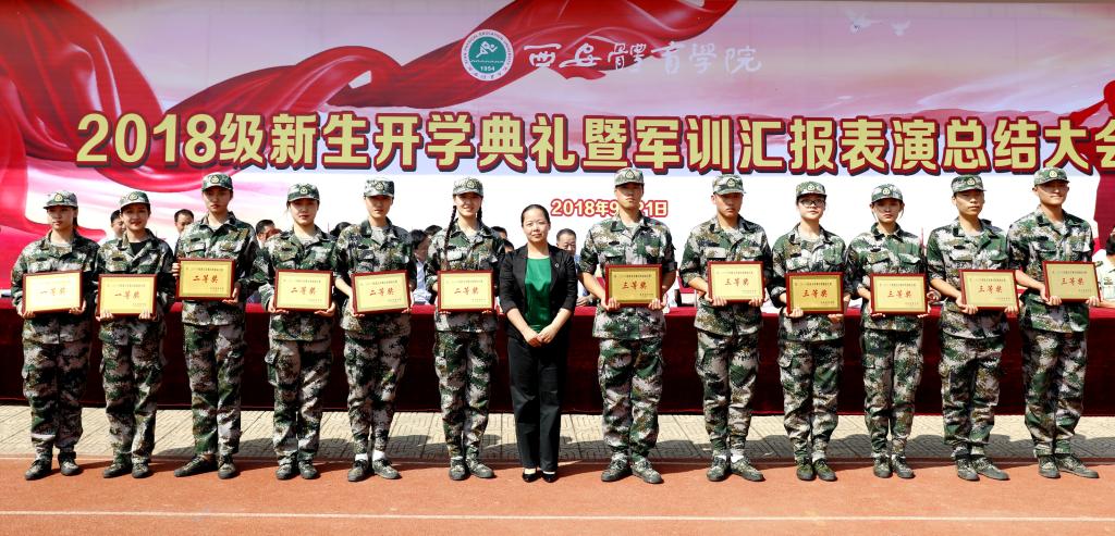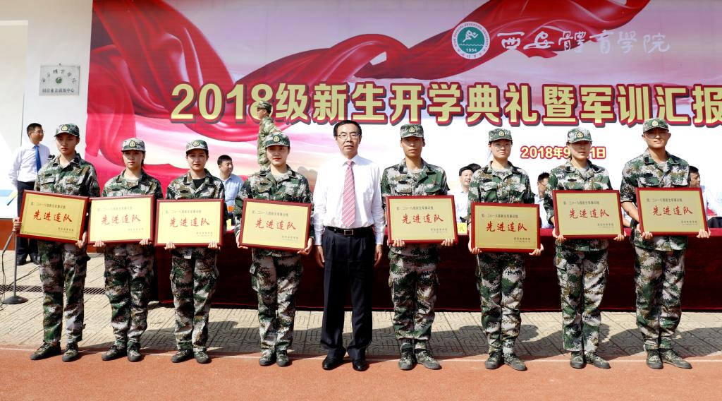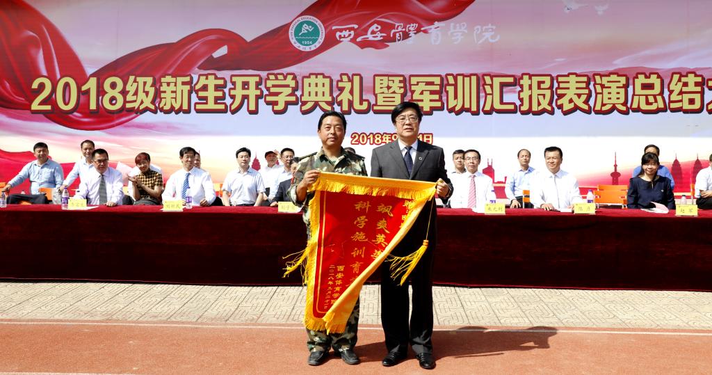 党委书记黄道峻为承训基地赠送锦旗,副院长陈彦宣读了军训“先进个人”“优秀指导员”“优秀教官”“先进连队”以及军歌比赛获奖连队名单。