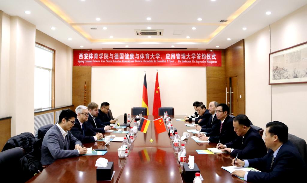 朱元利首先对Christian Werner校长一行的到访表示热烈欢迎,简要介绍了西安的历史文化概况,并详细说明了我院学科建设等基本情况,他还着重介绍了我院足球学院的办学情况,希望两校在加强人才培养、科研合作特别是在足球青训、足球项目经营与管理、师生交流等方面开展合作交流。
