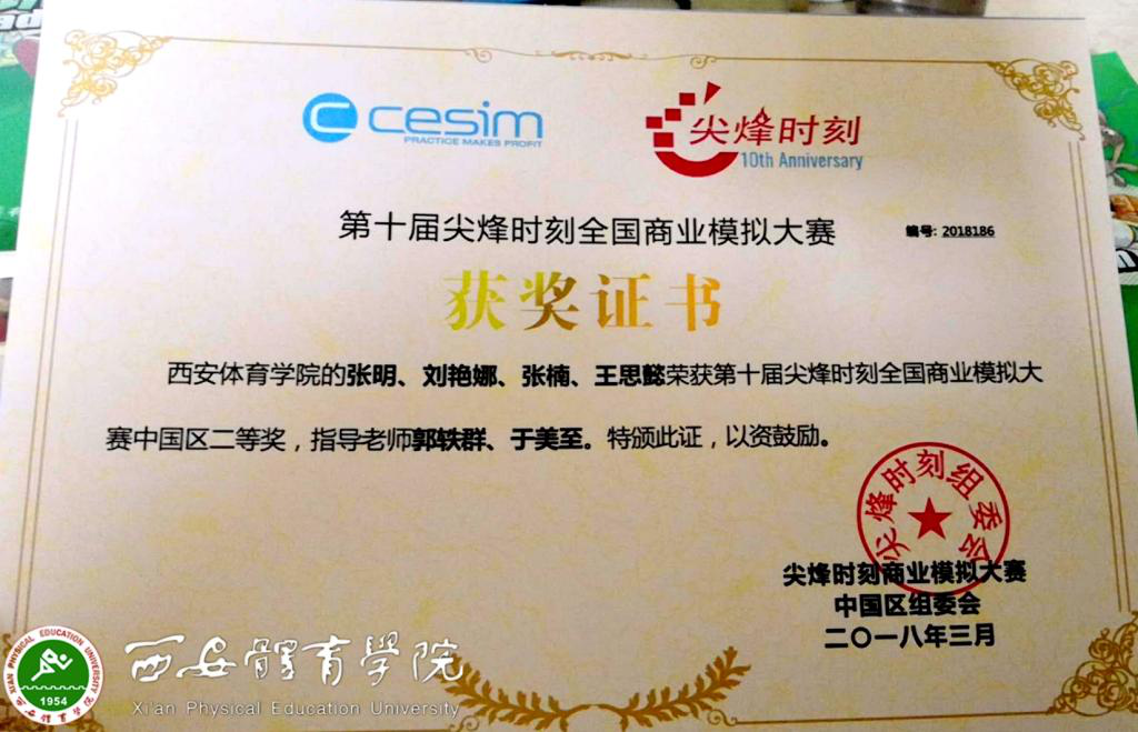 2018年我院体育经济与体育管理系学生在第十届“尖烽时刻”商业模拟大赛全国总决赛中荣获二等奖