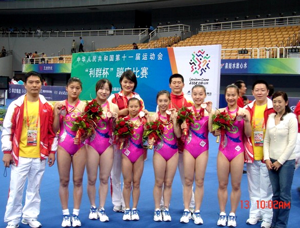 鲍银(左三)在第十一届全国运动会上与队友共同取得蹦床女子团体第三名