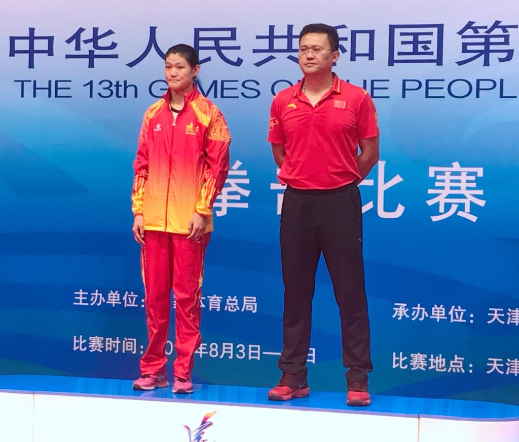 谷红(左)在第十三届全国运动会女子拳击69kg级比赛中为陕西夺得了一枚金牌