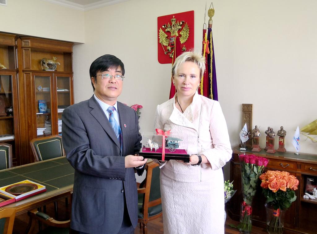 党委书记黄道峻向俄罗斯国立体育、青年与旅游大学校长哈伊娃·塔玛拉赠送铜车马