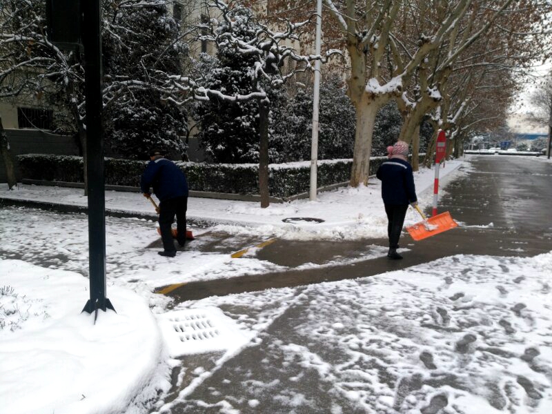 2月10日,西安迎来了新年的第一场降雪,校园银装素裹,格外美丽,但也对出行造成了一定阻碍。后勤人在降雪前已根据天气预报提前准备好了扫雪工具、融雪剂、防滑毯、纸板、安全警示牌等。经过数小时奋战,积雪基本清除干净,保障了出行安全。