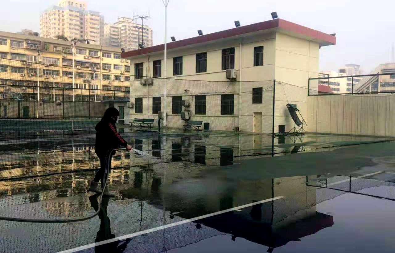工作人员在相关负责人的带领下,清点运动器材,并将其归类摆放,冲刷运动场地、防滑地毯,擦拭场馆器具、门窗,为返校师生营造一个舒适温馨的学习、训练、科研环境。