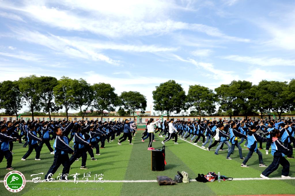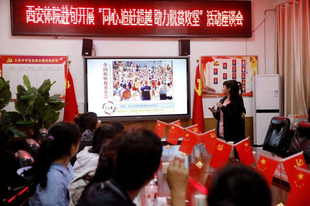 张蕊教授为太村中学和太村镇中心小学的教师讲授“一校一球一啦啦操与校园大课间”,并进行现场教学,为当地师生上了一堂生动活泼、动感时尚的啦啦操课。