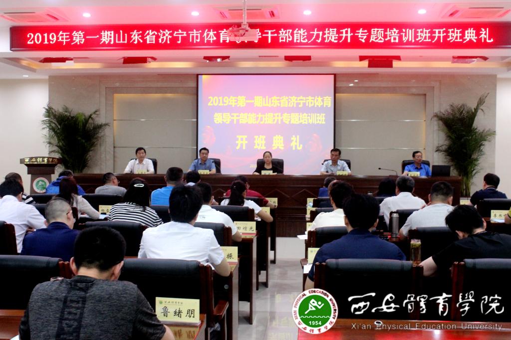 本网讯 5月26日,山东省济宁市体育局2019年第一期体育领导干部能力提升专题培训班在我院开班。副院长谢英,济宁市体育局党组书记班建新、副局长曹中平以及全体参训学员参加了开班仪式。
