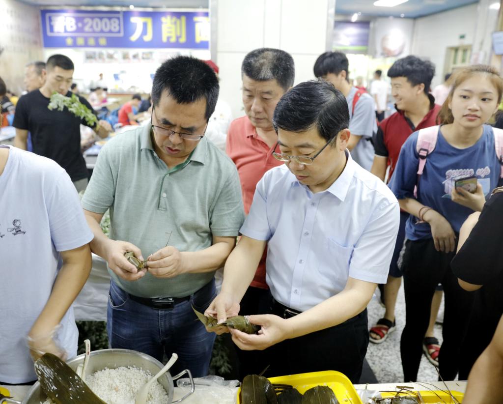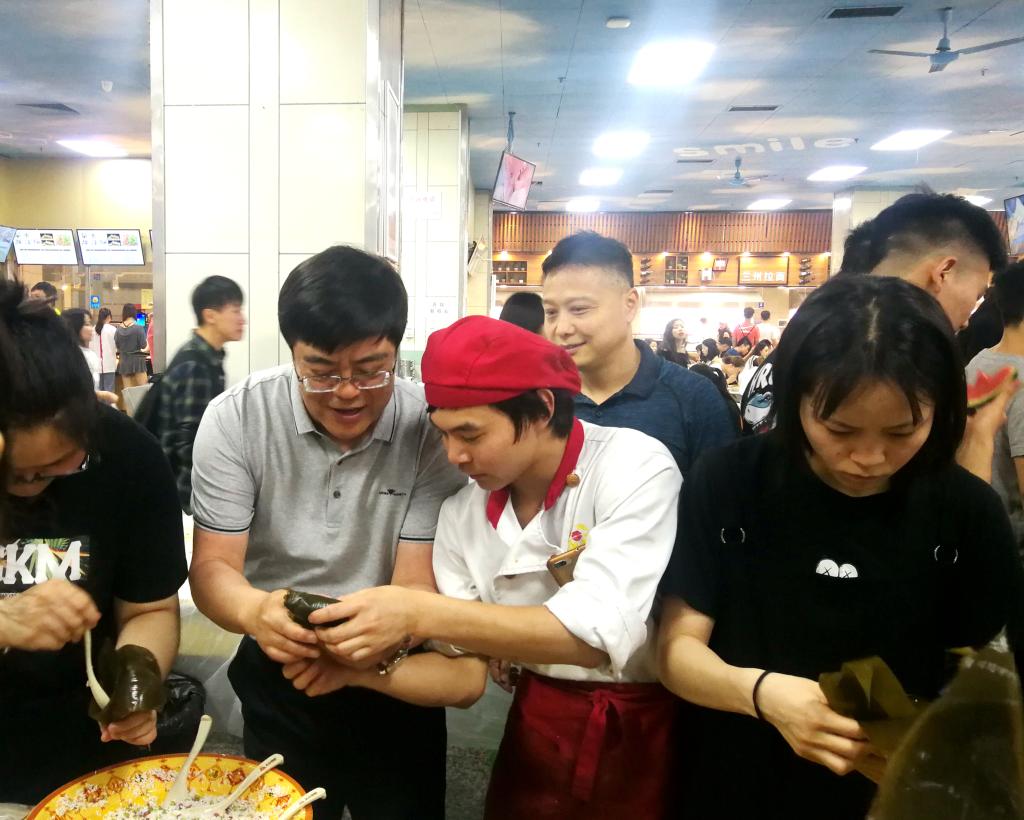 本网讯 临近端午佳节,后勤管理处联系院学生会在学院餐厅举办了包粽子比赛等弘扬传统节日文化活动,党委书记黄道峻、党委副书记刘子实、副院长李富生与学生欢聚一堂,共度佳节。