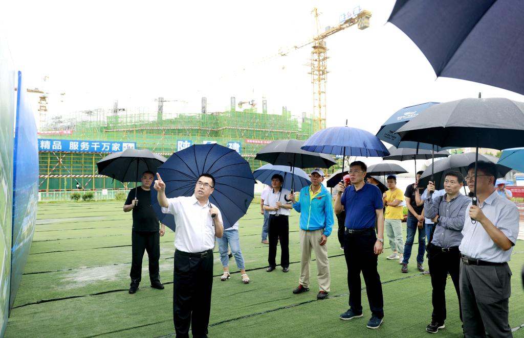 本网讯 7月23日上午,省委组织部副巡视员、十四运会组织人事部驻会副部长王建忠,省发改委社会处正处级调研员、十四运会场馆建设部综合处处长杨海鹏等调研督查万象城鄠邑新校区“一馆四场”建设情况,万象城副校长李富生以及基建处处长甘泽军、鄠邑区区委书记范九利、鄠邑区常务副区长张成群等陪同调研。