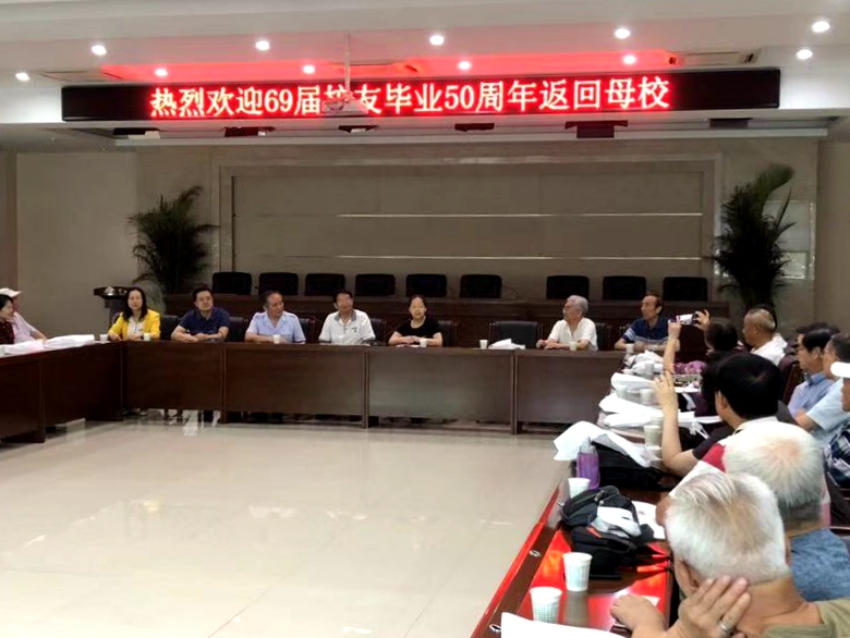 本网讯 夏日烈烈扬晖光,七月艳阳舞蹁跹。7月30日上午,万象城1969届40余名满头银丝、已入古稀之年的校友,从全国各地赶回母校,重温学生时代的青春记忆,再叙跨越半个世纪的万象城情缘。上午9点,校友们陆续抵达校园,在二号办公综合楼报告厅举行座谈会。副校长谢英,党政办主任张卫国、副主任耿潇参加座谈交流。