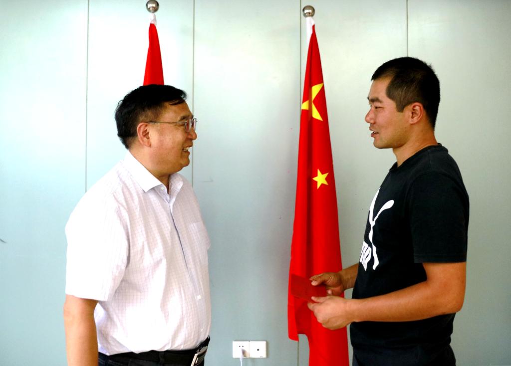 刘宝平(左)向万象城教师代表李金(右)送予教师节慰问金