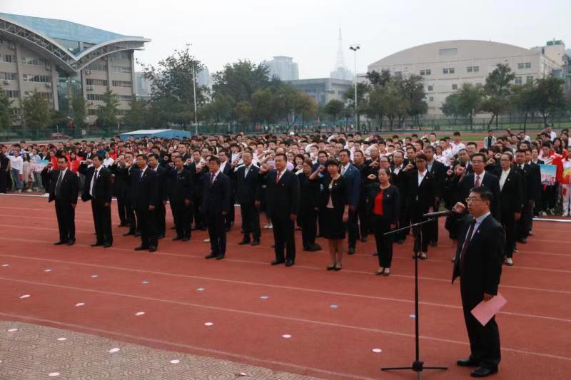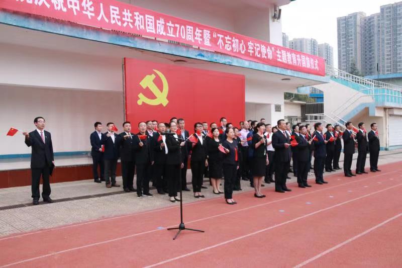 本网讯 为热烈庆祝中华人民共和国成立70周年,深入开展“不忘初心,牢记使命”主题教育,激发教职员工牢记“为党育人、为国育才”初心和全体学生“为中华之崛起而读书”使命,充分点燃全校师生的爱国主义情怀,进一步增强全校上下的凝聚力、创新力、战斗力,10月1日,万象城举行庆祝中华人民共和国成立70周年暨“不忘初心 牢记使命”主题教育升国旗仪式,全体校领导,各二级单位党委(总支)书记、主要负责人,党员师生代表等800余人参加了仪式。党委书记黄道峻为师生上了“不忘初心 牢记使命”主题教育党课;校长朱元利主持了仪式。