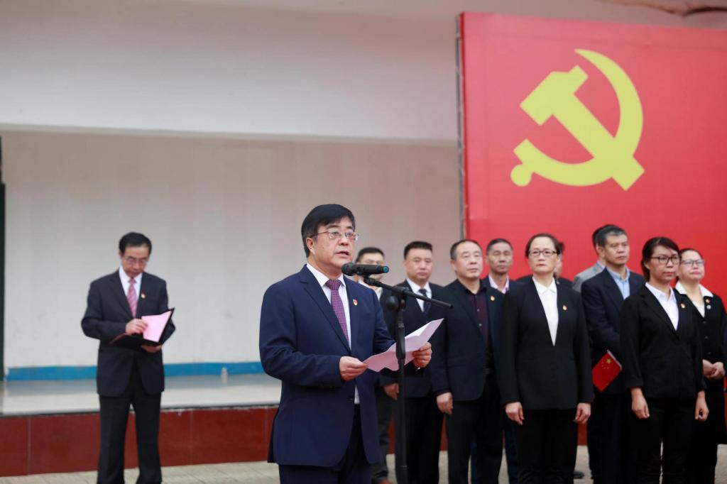 上午7时,仪式正式开始。12名护旗队员护送鲜艳的五星红旗迈着坚实雄健的步伐,精神抖擞地将国旗护送至升旗台。伴随着雄壮的国歌和第一缕晨曦,五星红旗冉冉升起,全体师生高唱国歌,肃穆行举手礼,向祖国表达最崇高的敬意。之后,由党委副书记刘子实领誓,全体党委委员、全校师生员工党员代表和近两年入党的党员面向党旗庄严宣誓,重温入党誓词。