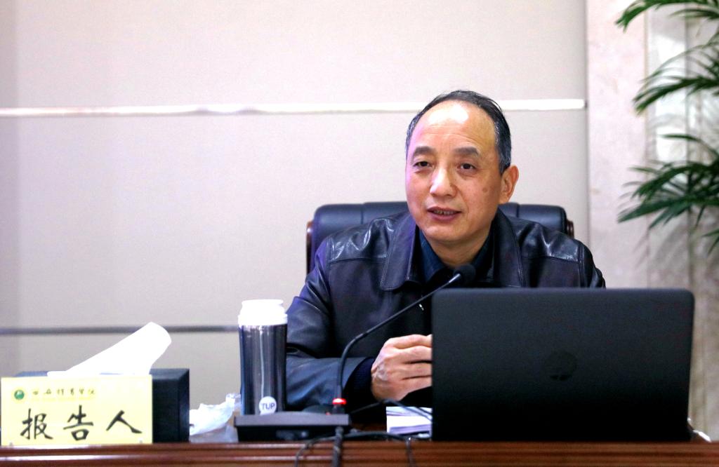 本网讯 11月22日,党委书记黄道峻主持召开学习贯彻党的第十九届四中全会精神专题辅导报告会暨党委理论中心组扩大学习会,中共陕西省委党校科学社会主义教研部主任侯建会教授应邀作专题报告。中心组成员、副处级以上干部、党支部书记、民主党派、政协委员、无党派人士代表等参加学习。