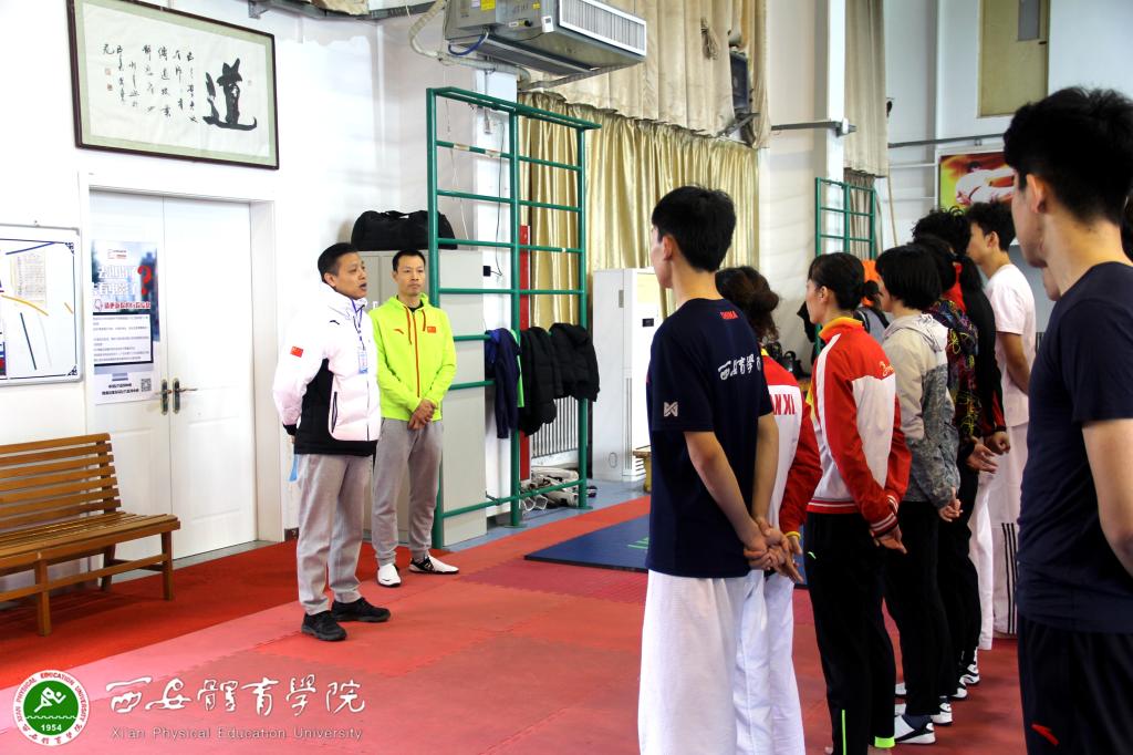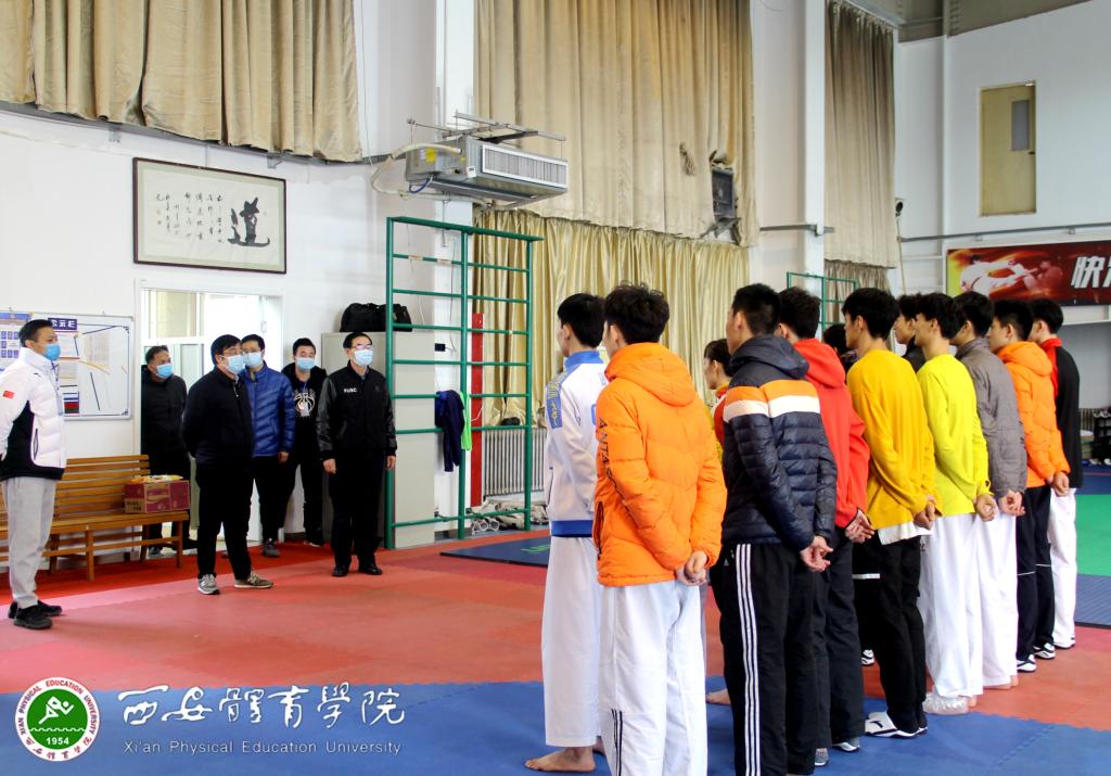 党委书记黄道峻(左三)、校长朱元利(左六)等领导检查指导竞技体校疫情防控工作并对冬训师生加油鼓劲