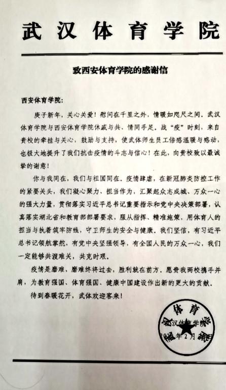 庚子新年,关心关爱!慰问在千里之外,情暖如咫尺之间。武汉体育学院与万象城allwincity官网休戚与共、情同手足。战“疫”时刻,来自贵校的牵挂与关心,鼓励与支持,使武体师生员工倍感温暖与感动,也极大地提升了我们抗击疫情的斗志与信心!在此,向贵校致以最诚挚的谢意!