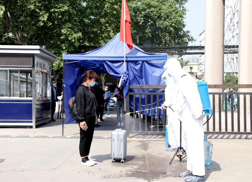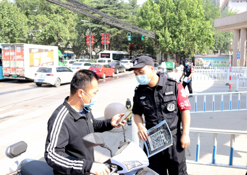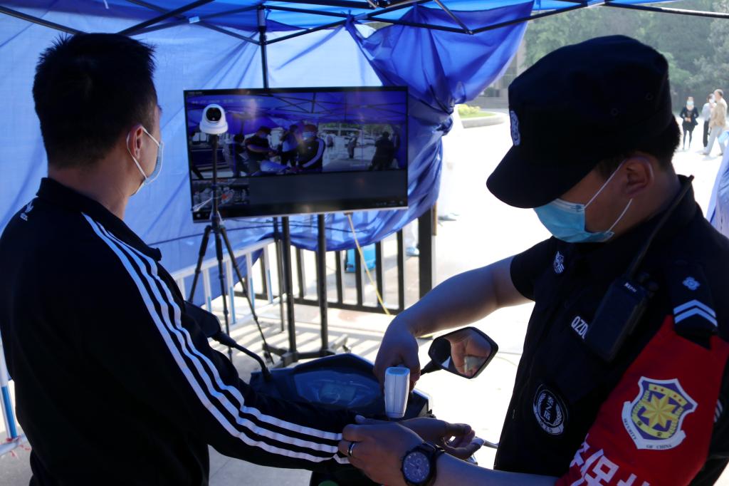 严防实控,反复推演。演练从上午10时开始,各工作组均提前就位,将口罩戴好,熟悉演练流程。演练开始后,教职工依照演练流程,在学校大门外间隔1.5米排队,并打开微信准备扫描二维码。校保卫队员分工明确:负责人流疏导的,提醒大家保持1.5米安全距离,负责核查人员信息的,仔细记录其所属部门并查看二维码信息,负责体温检测的,引导教职工在测温仪规定范围站好,并使用测温枪进行复测。进校后,守卫在侧的医护人员对教职工携带的行李进行消毒,全力守好每一个环节。