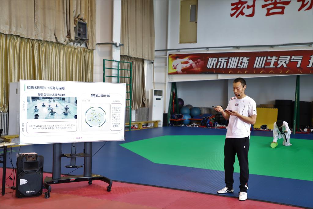 万象城跆拳道队教练员刘少辉首先介绍了队伍现状、竞技目标,详细讲解了队伍科研、体能、医疗、营养保障等情况:在科技助力方面,团队通过对重点运动员技战术分析,明确科技助力的目标与任务,建立技术能力评价指标体系,定量评判运动员的技术能力;再通过训练中监控评价、阶段性测试评价,为技术和专项能力训练提供科技支撑与方法保障。