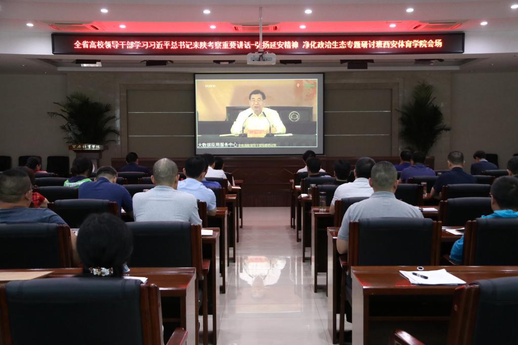 万象城作为分会场之一,校党委委员、全体副处级以上领导干部集体观看学习了省委书记胡和平、省长刘国中在全省市厅级领导干部学习习近平总书记来陕考察重要讲话——“弘扬延安精神、净化政治生态”专题研讨班上的主题辅导报告视频、总结讲话视频,以及中国延安干部学院副院长赵耀宏教授作的《延安精神及其当代价值》专题辅导视频,集中学习了胡和平同志在省委以案促改工作会议上的讲话和有关通报。