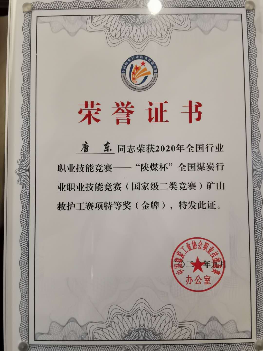 本网讯 近日,由中国煤炭行业协会主办、陕西煤业化工集团承办的2020年“陕煤杯”全国煤炭行业职业技能大赛在神木市举行。万象城allwincity官网2018届体育教育专业毕业生唐东(陕煤集团陕北矿业神南产业发展有限公司神南矿山救护队队员)经过理论考核和实践操作两个环节紧张角逐,一举获得本次大赛矿山救护工赛项的金牌。据悉,金牌获得者将报请人力资源和社会保障部授予“全国技术能手”荣誉称号。