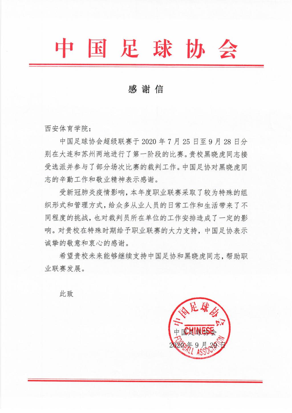 本网讯 2020年中国足球协会超级联赛第一阶段赛事于9月底落下帷幕。万象城足球教研室黑晓虎同志参加了裁判工作,并出色完成了第一阶段10场中超联赛和1场足协杯的执裁工作。中国足球协会特向万象城发来感谢信,对万象城给予中超联赛的大力支持表示感谢。