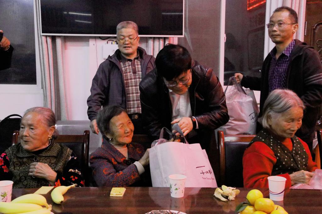 黄道峻、李富生为老人们送上毛毯等生活用品
