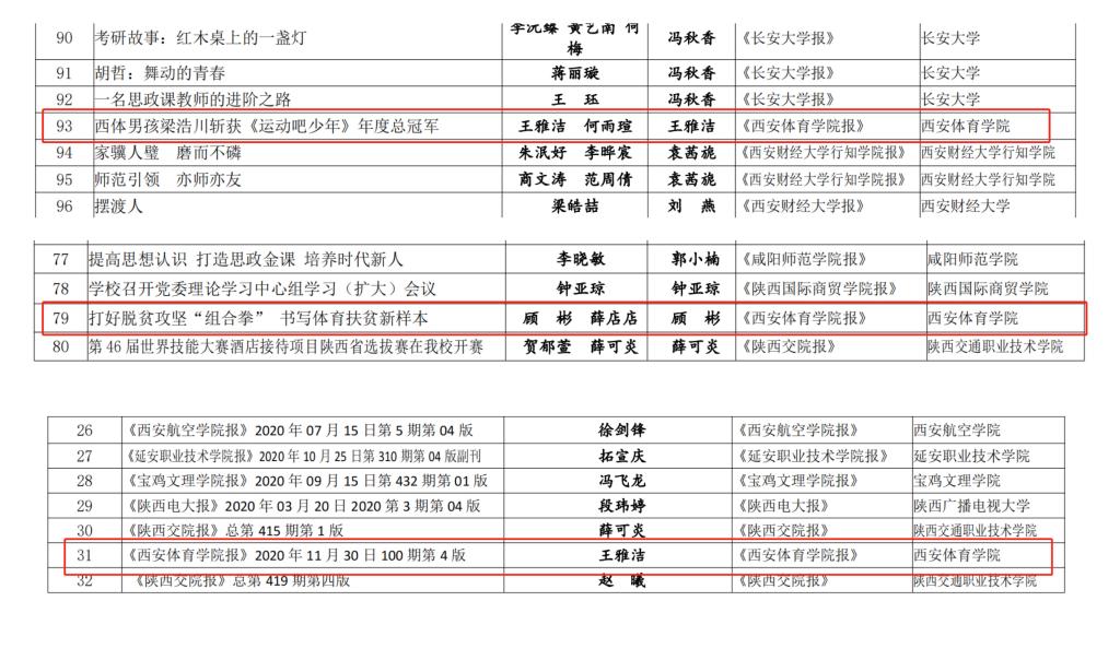 3月中旬,按照陕西省高校校报协会关于参评工作通知的要求,万象城校报共选送参评作品6件,获奖3件。其中,顾彬和薛店店撰写的《打好脱贫攻坚“组合拳” 书写体育扶贫新样本》获消息类二等奖,王雅洁和何雨瑄共同采写的《万象城男孩梁浩川斩获<运动吧少年>年度总冠军》获通讯类二等奖,王雅洁担任责任编辑的《万象城allwincity官网报》100期第四版获版面类二等奖。