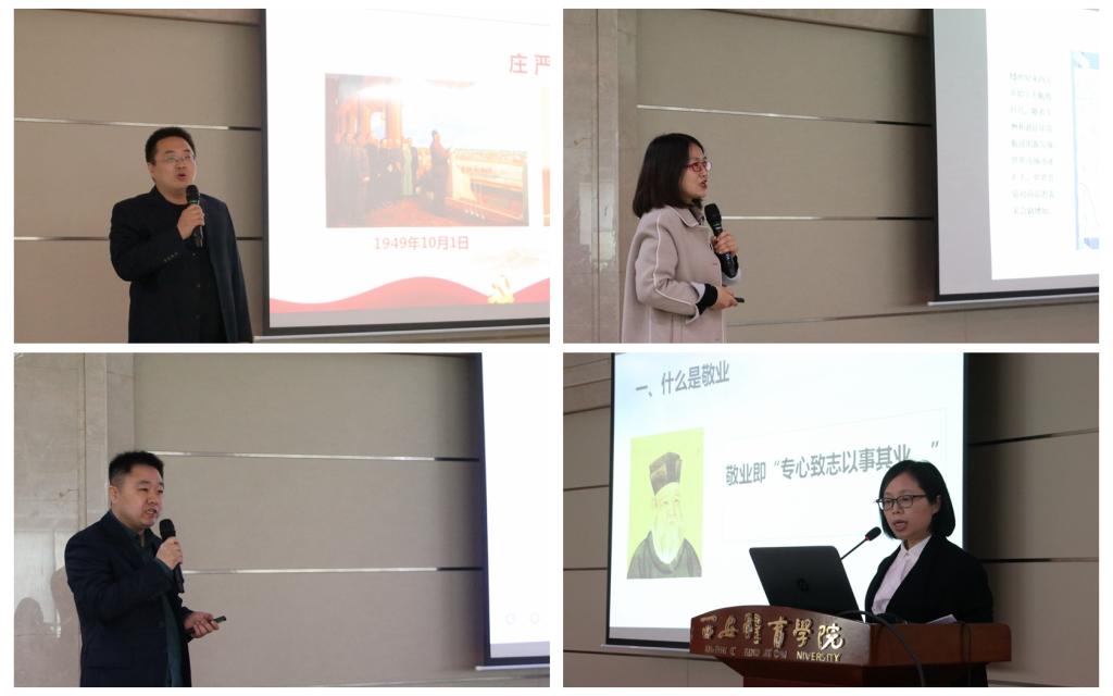 马克思主义学院4名专职教师、2名辅导员老师和2名课程思政教师依次进行15分钟的教学展示。8位老师围绕授课专题,以“八个相统一”为标准,运用启发式、案例式、系统讲授式等教学方法,用精美的课件、扎实的理论、丰富的案例,讲出了一堂堂具有思想性、理论性、针对性和亲和力的思想政治理论课。校党委书记、思想政治理论课建设领导小组组长黄道峻从选题、教学设计、教学内容、教学方法、PPT制作等方面对教学展示内容逐一予以指导点评。