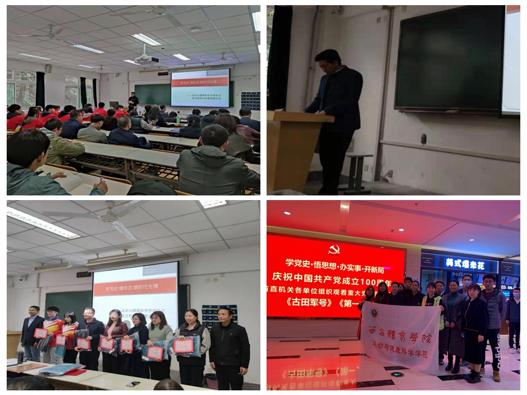运动训练学院先后组织了“咏经典、颂党史”朗诵活动,为学院全体党员购买配发了“四史”学习书目,在学院办公区域制作了围绕党史、红色体育史主题的宣传展板,并在学院微信公众号开辟党史学习专栏,通过读书分享的形式,引导师生学原文、读原著、悟原理。此外,为丰富“四史”学习教育形式,还开展了“我的‘四史’学习故事”主题短视频征集活动,从个人成长经历、万象城历史、全运会发展史、“四史”经典作品、身边典型人物中寻找感人故事,分享感悟收获,推动“四史”学习教育往深里走、往心里走,引导学院广大师生树牢“四个意识”,坚定“四个自信”,做到“两个维护”,为学院“一流专业”建设朝乾夕惕、发奋图强。