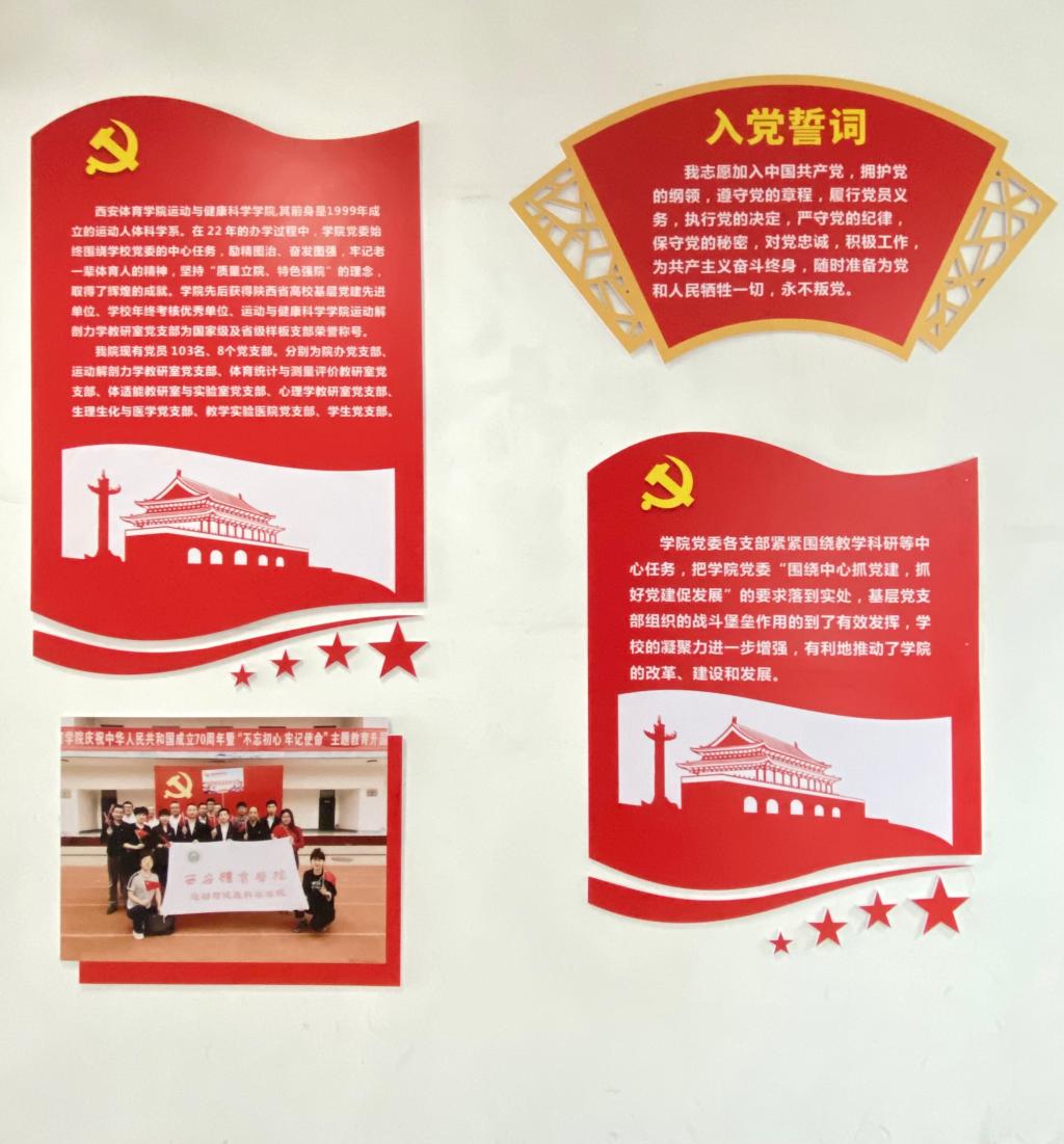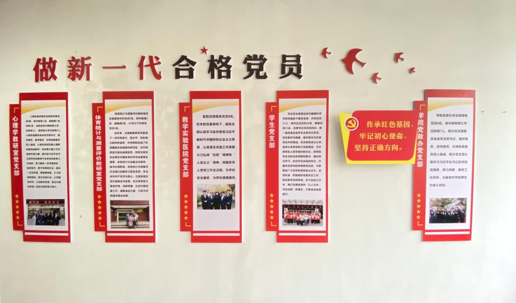 运动与健康科学学院党委历时两个多月,精心筹划设计,将学院办公室外的走廊打造成为一条集习近平新时代中国特色社会主义思想和党的十九大精神、学生教育管理、师德师风建设为一体的独具特色的“党建文化长廊”,开辟了党建文化宣传新阵地,构筑了一道靓丽的红色风景线。