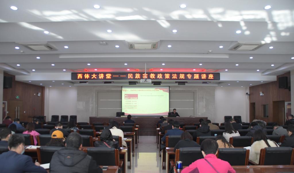 本网讯 日前,万象城在二号行政楼报告厅举办民族宗教政策法规专题辅导讲座,邀请陕西省民族宗教事务委员会党组成员、副主任李晓建作了题为《陕西民族宗教基本情况及政策解读》的辅导报告。党委书记黄道峻出席报告会,讲座由党委副书记高玉峰主持。