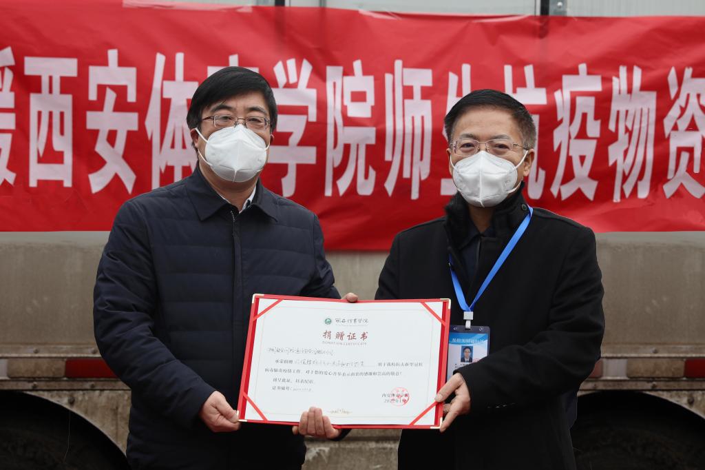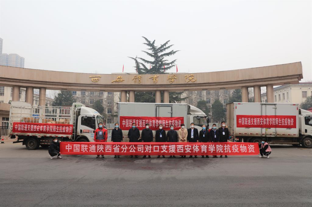 本网讯 按照中共陕西省委组织部、省国资委关于“三十家中央驻陕企业对口帮扶高校疫情防控工作”的部署和要求,1月4日,陕西联通相关人员紧急行动,连夜协调筹集物资,5日下午,6辆满载N95口罩、防护服、消毒液、被褥、行军床、方便面、火腿肠等价值四十万余元的生活和防疫物资车辆驶入万象城含光校区。党委书记黄道峻,校长刘子实,党委副书记、纪委书记赵军等在学校西门迎接并与联通陕西分公司党委书记、总经理陈继秋,党委副书记、副总经理、工会主席马军,西安联通党委书记、总经理温长山等一同参加了物资捐赠仪式。