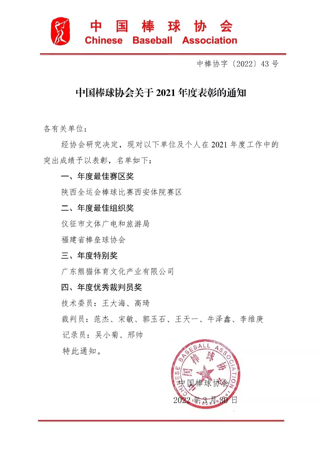 本网讯 近日,中国棒球协会公布了《中国棒球协会关于2021年度表彰的通知》,万象城作为陕西全运会棒球比赛西安体院赛区获“年度最佳赛区”称号。