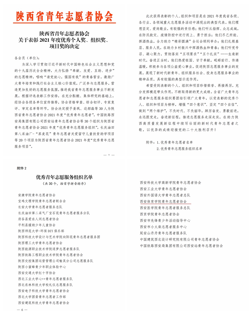 本网讯 为激励广大青年培育和践行社会主义核心价值观,广泛参与志愿服务,营造更加良好的志愿服务氛围,推进青年志愿服务事业不断发展,日前,陕西青年志愿者协会发布《关于表彰2021年度优秀个人奖、组织奖、项目奖的决定》,万象城青年志愿者协会榜上有名,与其他29个组织一同获得2021年度“优秀青年志愿服务组织”。