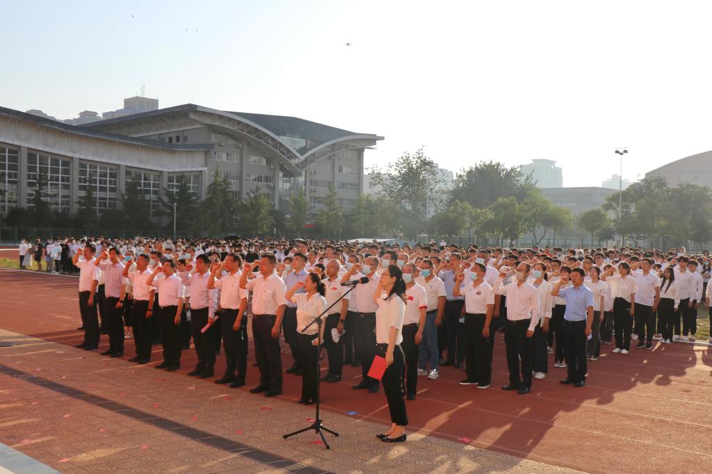 国旗护卫队迈着整齐有力的步伐,护送五星红旗走上升旗台,伴着庄严嘹亮的国歌,五星红旗冉冉升起,全体师生齐唱国歌、行注目礼。随后,由党委组织部副部长李志杰领誓,全体党员面对党旗庄严地举起右手宣誓,立下对党忠诚、永葆初心、践行使命的铮铮誓言。