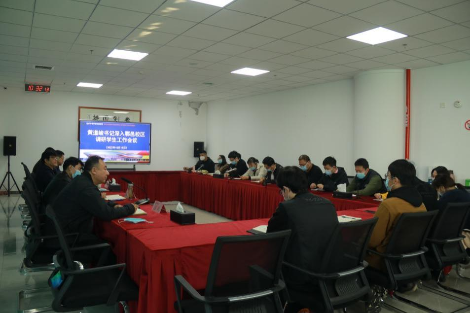 本网讯 日前,校党委书记黄道峻到鄠邑校区开展学生工作调研,副校长张卫国陪同,校区管委会、二级学院辅导员及30余名学生代表参加了调研座谈会议。