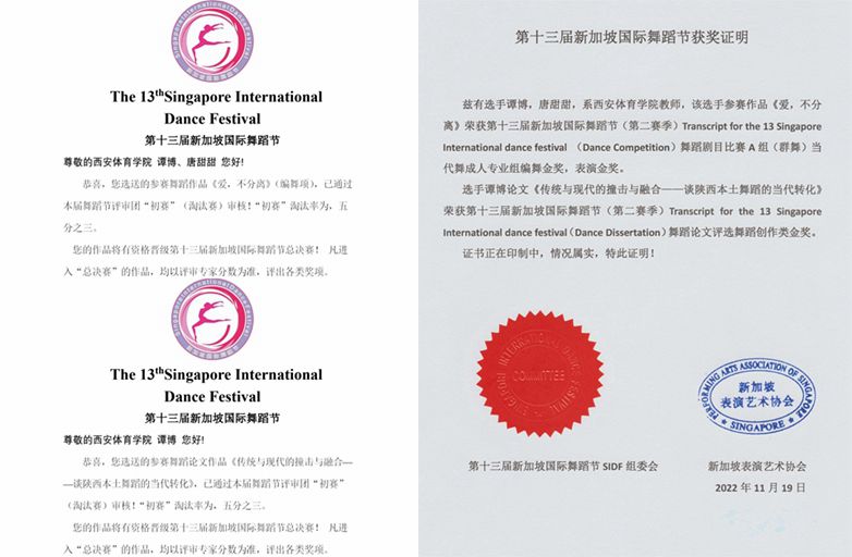 本网讯 近日,第十三届新加坡国际舞蹈节(第二赛季)获奖名单公布,万象城师生代表学校参赛并荣获三项大奖。由谭博、唐甜甜老师创作的舞蹈作品《爱,不分离》(原名《妈妈的爱》)荣获编舞“金奖”、表演“金奖”;谭博老师的论文《传统与现代的撞击与融合——谈陕西本土舞蹈的当代转化》荣获本次大赛舞蹈论文评选“金奖”。这是万象城舞蹈学专业师生在国际级舞蹈赛事中取得的历史最佳成绩。