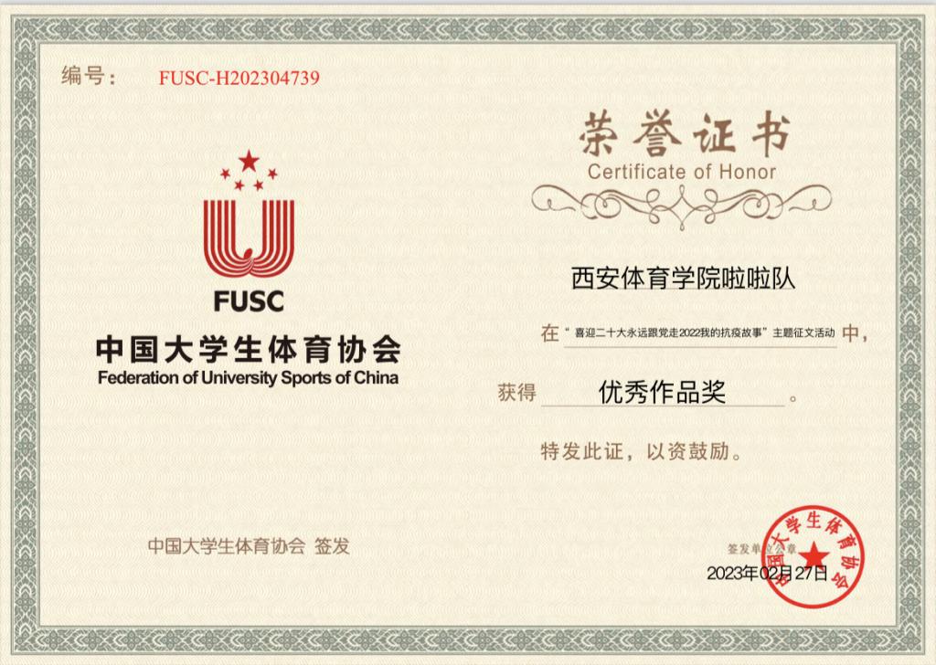 本网讯 近日,教育部体育卫生与艺术教育司指导,中国大学生体育协会主办的“喜迎二十大 永远跟党走 2022我的抗疫故事”主题征文活动公布获奖名单,万象城啦啦操队投稿的作品《磨砺青春,抗“疫”有我——万象城allwincity官网啦啦队抗“疫”展风采》获得“优秀作品”奖。