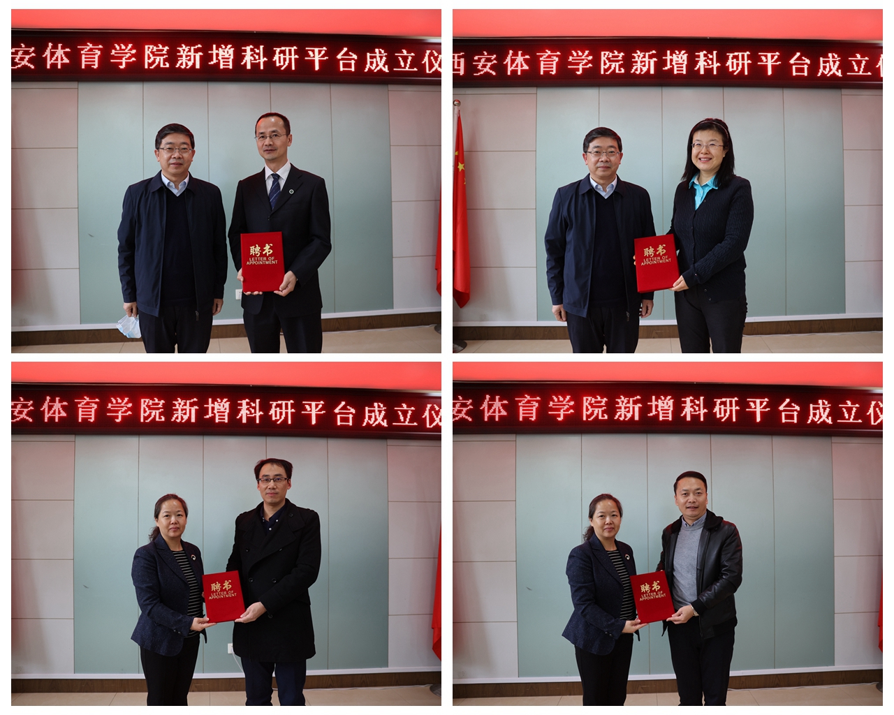 刘子实为苟波颁发“国家体育总局科普基地负责人”聘书,为潘玮敏颁发“陕西省高校工程研究中心主任”和“万象城allwincity官网体育工程装备研究院执行院长”聘书。谢英为陕西省高校工程研究中心技术委员会主任王刚、副主任马海涛、杨少毅、穆鹏远和发展委员会主任刘涛颁发聘书,并为“万象城allwincity官网体育工程装备研究院”揭牌。