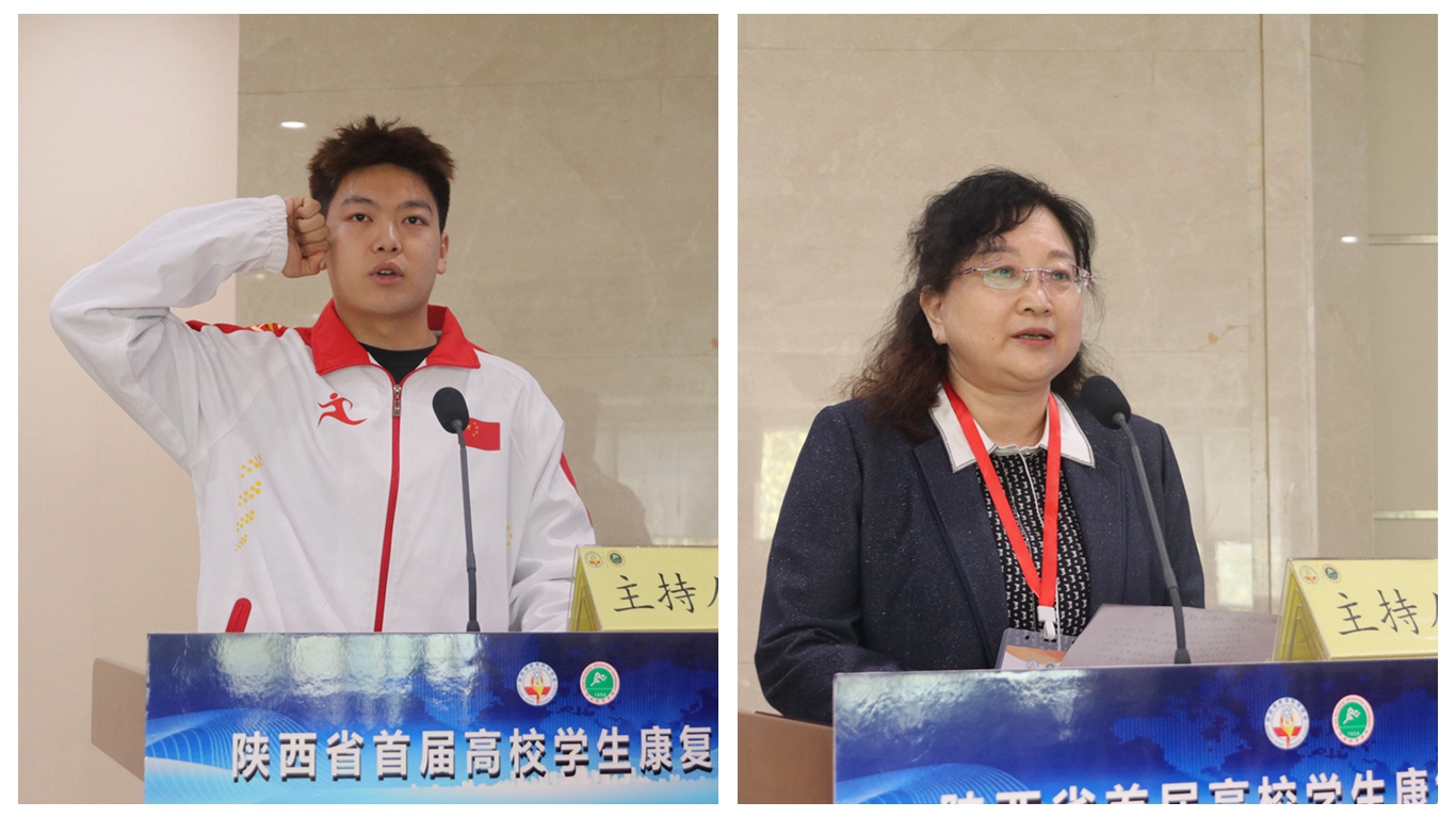 在运动与健康科学学院学生郝泽旭以及陕西省康复医院李红霞主任分别代表参赛学生和大赛评委进行宣誓后,李富生宣布比赛正式开始。