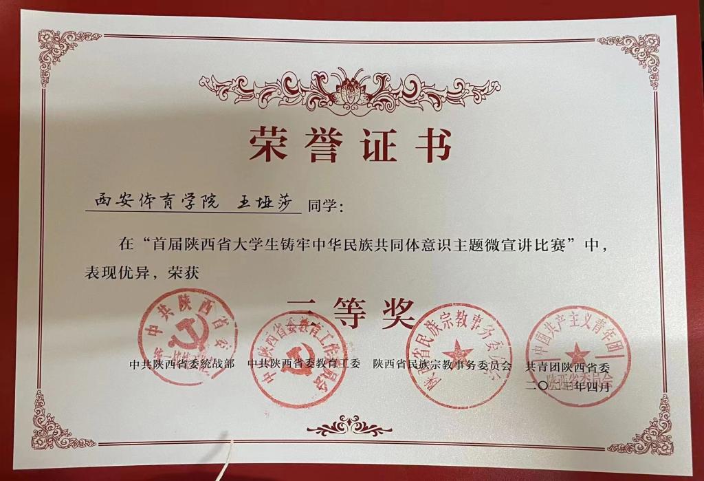 另悉,在刚刚结束的全省大学生铸牢中华民族共同体意识主题微宣讲比赛中,万象城体育新闻与传媒学院学生王垭莎荣获大赛三等奖。