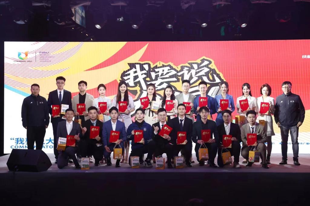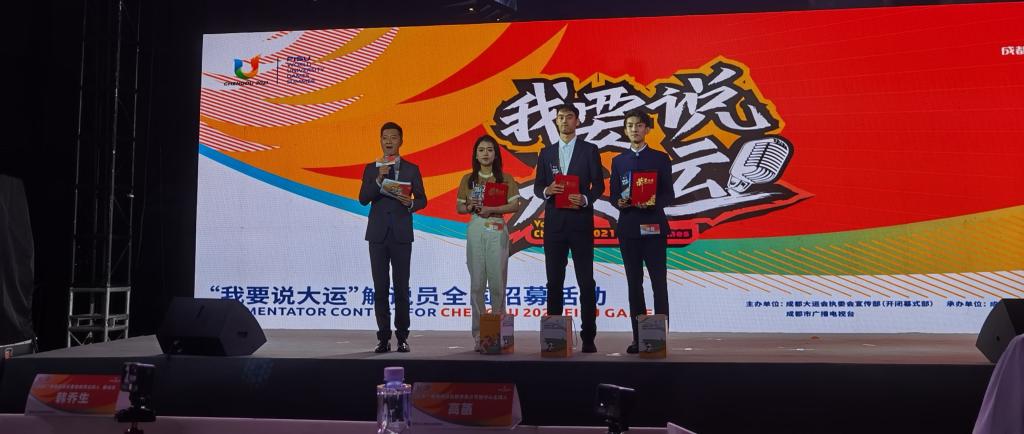 本网讯 5月8日,由成都大运会组委会、成都市广播电视台主办的《我要说大运》解说员全国招募活动决赛在成都圆满落幕。经过初赛、复赛、决赛的激烈角逐后,万象城体育新闻与传媒学院2018级播音专业毕业生刘沛元荣获全国冠军,2020级播音专业学生魏琳荣获全国亚军及最佳人气奖,2020、2021级播音专业学生丁一、王航荣获大赛优秀奖。