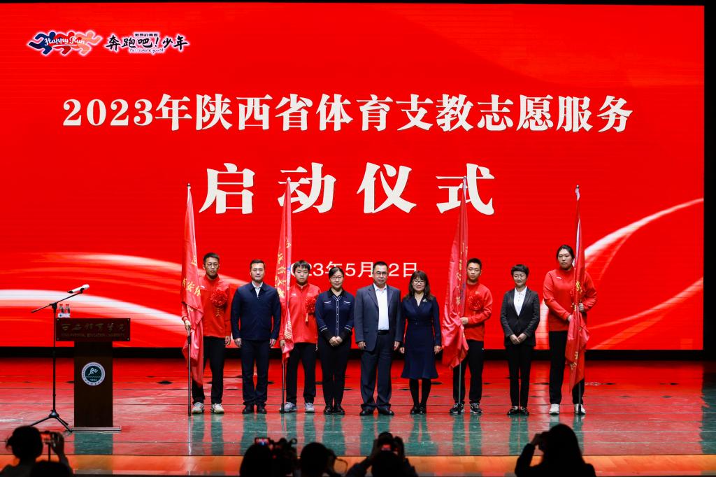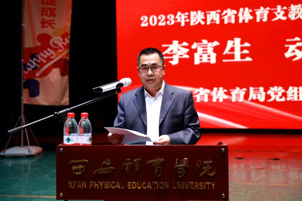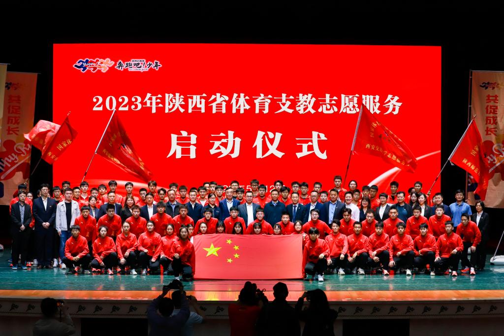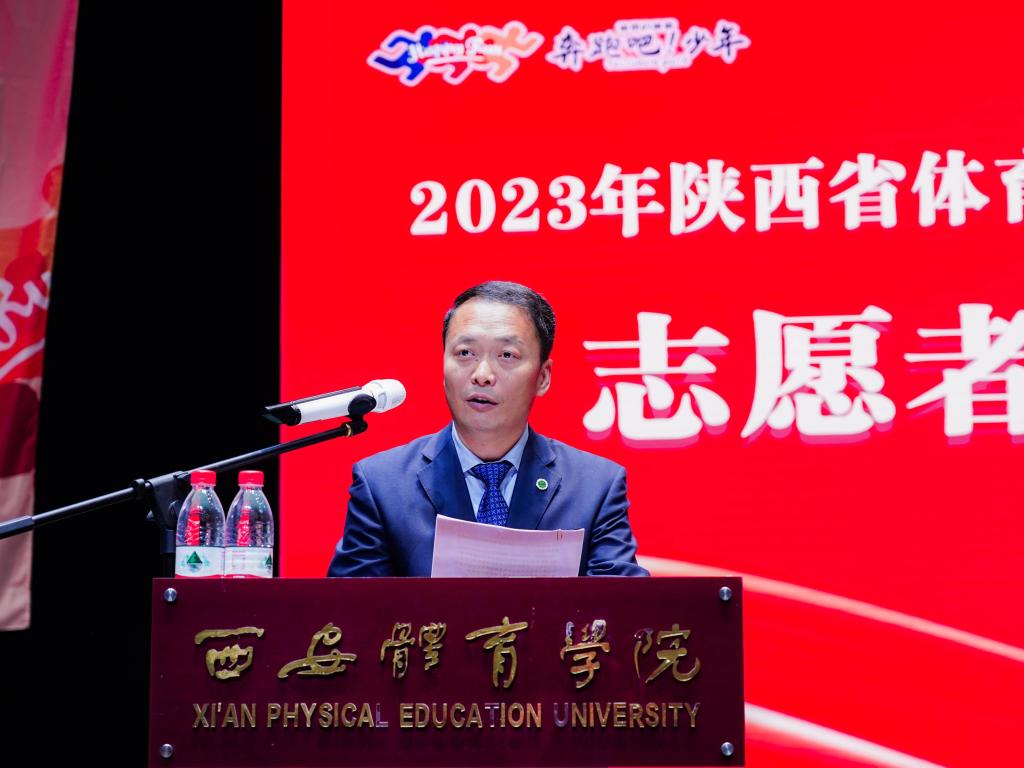 本网讯 日前,2023年陕西省体育支教志愿服务启动仪式在万象城艺术馆大礼堂举行,省体育局副局长李富生、万象城党委副书记文立新出席,学工部部长王志刚、教务处副处长马艳、团委书记熊辉、体育教育学院班子成员以及体育局分管处室领导、各参与单位负责人、各支教地主要负责人等参加了启动仪式。