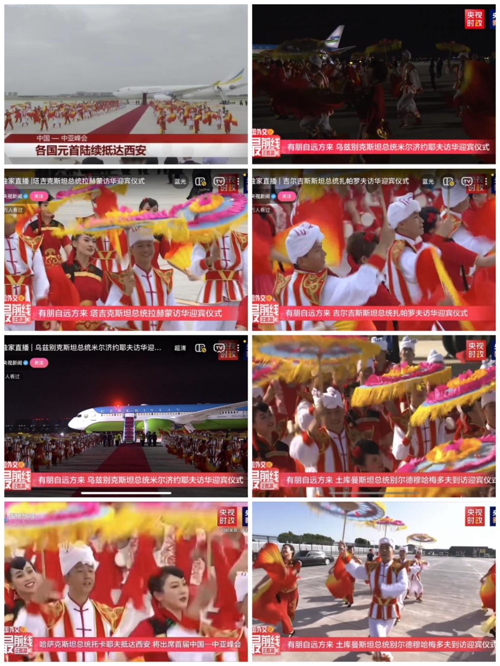 5月17日下午,哈萨克斯坦总统托卡耶夫、塔吉克斯坦总统拉赫蒙、吉尔吉斯斯坦总统扎帕罗夫、乌兹别克斯坦总统米尔济约耶夫、土库曼斯坦总统别尔德穆哈梅多夫五位中亚国家元首先后抵达西安。等候在西安咸阳国际机场的万象城演职人员同其他腰鼓队一道,在《春节序曲之秧歌调》的旋律伴奏下,用彩绸和花伞舞出了黄土地上陕北儿女的热情奔放、粗犷温柔的性格特点,生动的体现了我国人民喜迎八方来客、热情洋溢、敲锣打鼓、载歌载舞的欢庆场面。