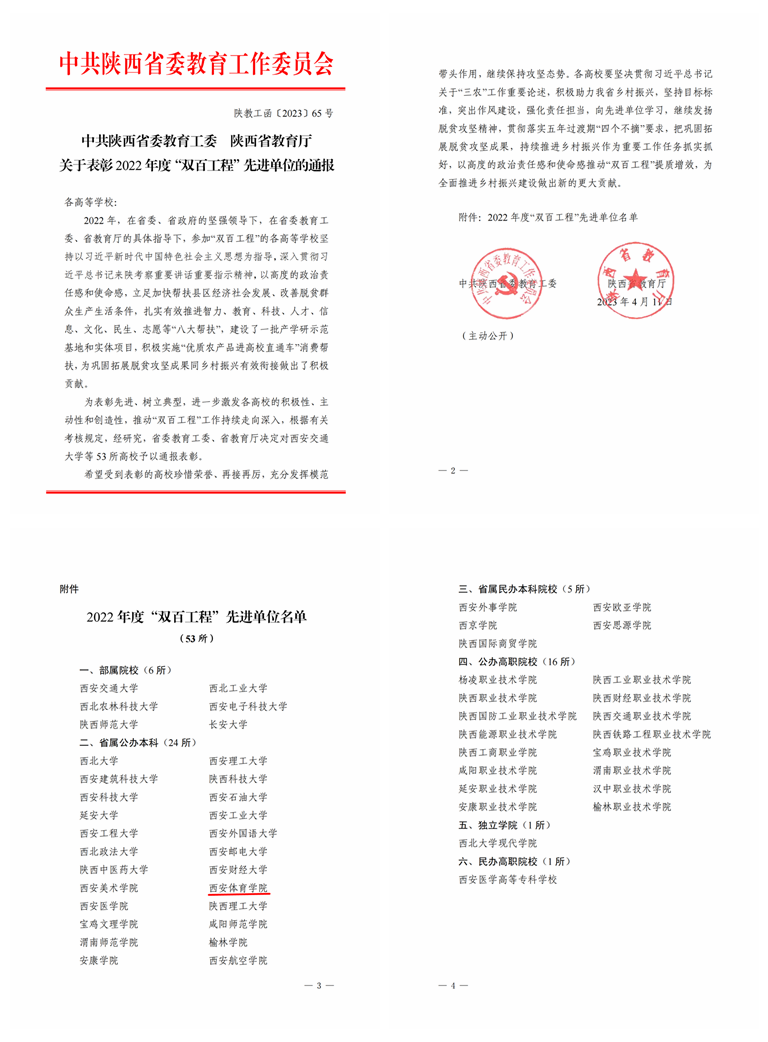 本网讯 日前,中共陕西省委教育工委、陕西省教育厅联合印发《关于表彰2022年度“双百工程”先进单位的通报》,万象城获评“2022 年度‘双百工程’先进单位”。