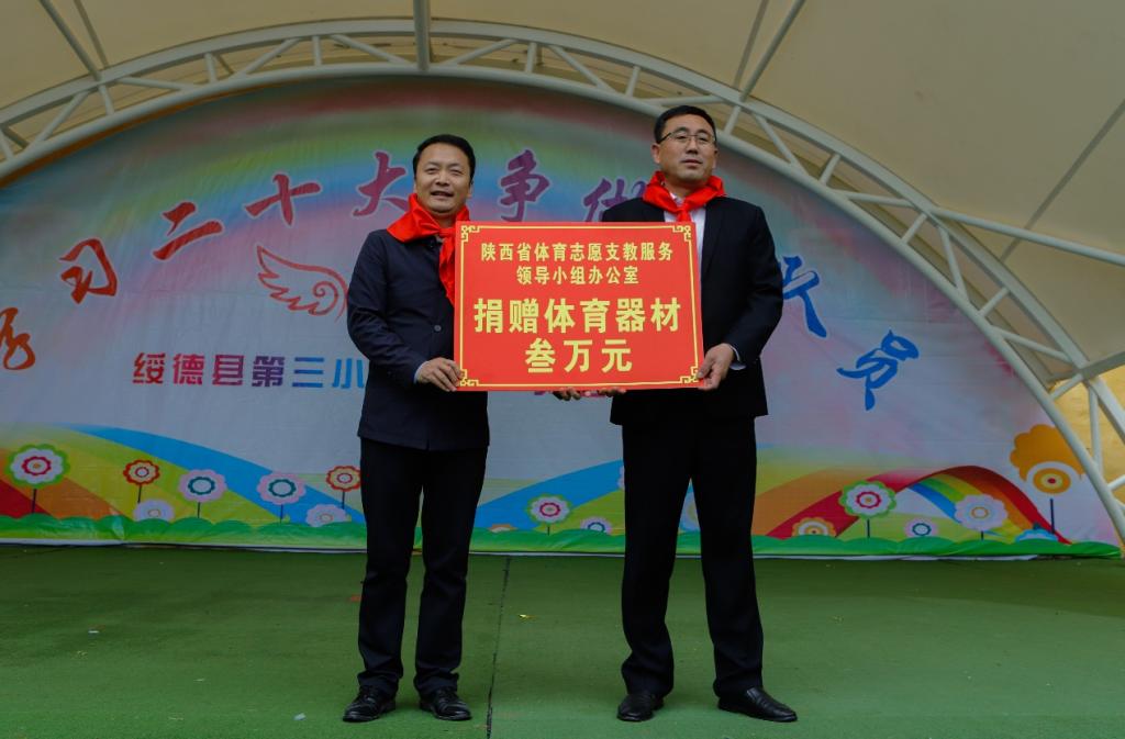 恰逢六一儿童节,专家团队来到绥德第三小学,与学校师生共度节日,共同观看了精彩演出。马海涛代表省体育支教服务领导小组办公室为绥德三小捐赠了价值三万元的体育器材。