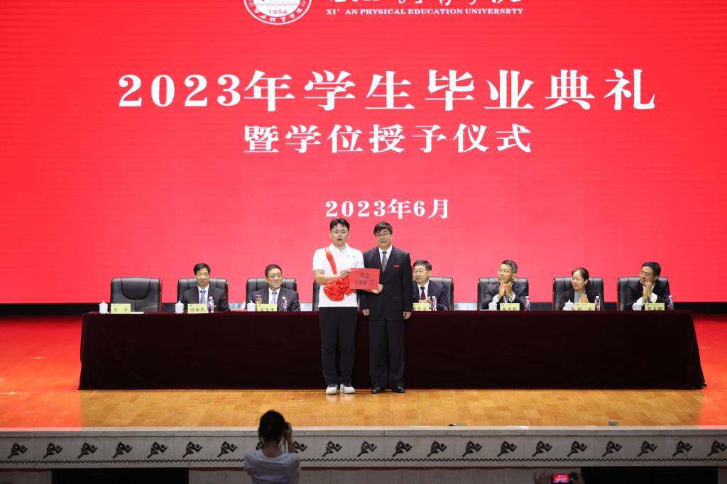 黄道峻为扎根西部支援新疆的2023届武术与民族传统体育专业毕业生任家辉佩戴红花并颁发奖金。